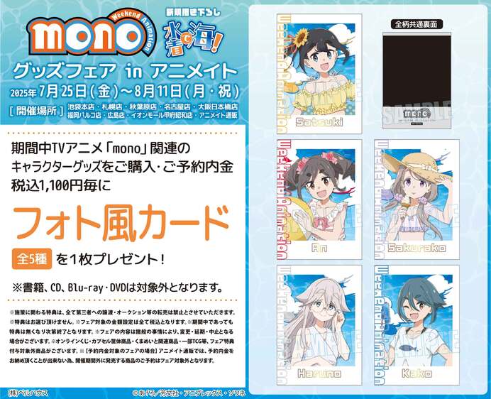 期間中、TVアニメ「mono」関連のキャラクターグッズをご購入・ご予約内金1,100円(税込)毎に「フォト風カード(全5種)」を1枚プレゼント!